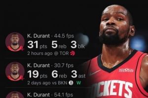 据统计,杜兰特火箭生涯4场比赛得分破百,队史第二快,仅次于哈登(3场)。